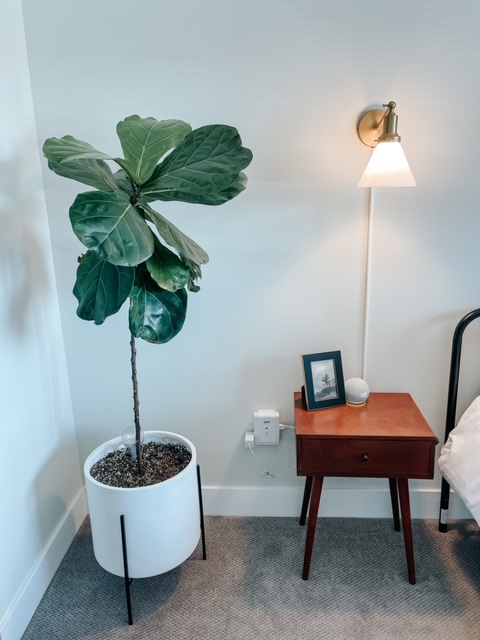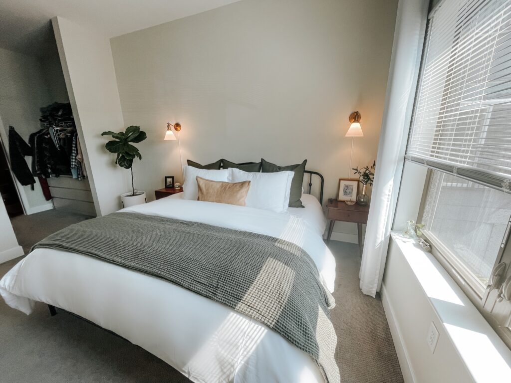 Our bedroom is often the most overlooked room in the house when it comes to decorating. Aside from aiming to have my bed feel like a cloud, there isn’t a lot that draws you to it. My sheets and comforters have always been white. My blackout curtains are white. I had simple white/glass lamps on wooden nightstands, with nothing on the walls other than a TV. In my previous apartment, I had a pretty sage colored rug. however the new apartment has carpeted rooms so there was no need to double up.